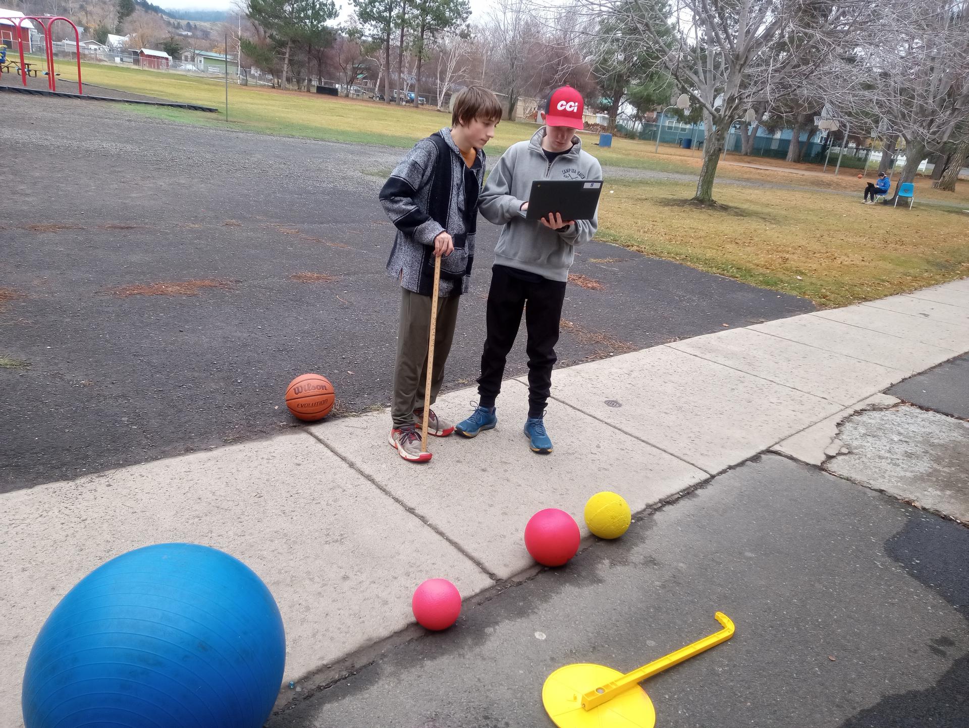 Caleb Hall and Ryan Mentgen making a model of the Solar System using balls |